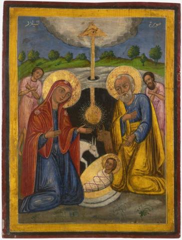 In this classic representation of the Nativity, we recognize the characteristics of the Ecole de Jérusalem (19th century): a pastel palette, a naïve style, a taste for the decorative, and a border of colored bands.