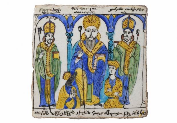 The tile shows Saint Gregory the Illuminator on a throne, holding the Armenian crozier with two snakes, surrounded by Saints Basil of Caesarea and John Chrysostom. At his feet kneel King Tiridate III, in the guise of a boar, and Saint Hripsime. The scene condenses the story of Gregory’s conversion of the Armenians: King Tiridate has Gregory, a Christian, tortured for refusing to sacrifice to idols, and condemns him to thirteen years in a pit filled with mud and snakes. Meanwhile, Tiridate falls in love with Hripsimé, a young woman who has fled to Armenia to escape the advances of Emperor Diocletian. When Hripsimé refused him, Tiridate had her tortured. Three days later, he is punished by Heaven and transformed into a boar. Tiridate’s sister has a dream and announces that only Gregory can restore her brother’s human appearance. Saved by the saint’s prayer, Tiridate is baptized by Gregory, who subsequently organizes the Armenian clergy. This tile belongs to a series commissioned by an Armenian dignitary to decorate the Church of the Holy Sepulchre in Jerusalem, where it was never installed.