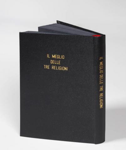 All 365 pages of the book, like so many days in the year, are black, evoking the idea that superimposing the three sacred scriptures would result in an illegible accumulation. The color also reflects the quarrels between the three religions. But the work also opens up a reflection on agnosticism, a school of thought which holds that no one can prove the existence of God, and on forms of spirituality other than those embodied by the three so-called “book” religions.
