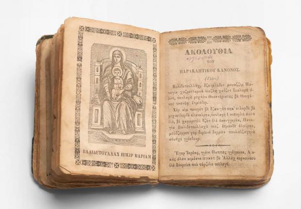 This illustrated prayer book is a relatively rare example of karamanlidika, works written in the karamanli language (Turkish written in Greek characters). These works constituted the mainly religious literature of the Greeks of Asia Minor. 752 titles published between 1718 and 1935 have been referenced. At the time, this production was a direct result of a concern to preserve the religious identity of Orthodox communities settled in Turkey, by helping believers who had become Turkish-speaking to understand dogma and liturgy. In the second half of the 19th century, editions multiplied to counter the development of Lutheranism, whose missionaries distributed liturgical books and catechisms on a large scale and free of charge. Their disappearance coincided with the departure of the Greek community from Turkey and the population exchanges at the end of the war. This copy was brought to France by a Greek Orthodox woman who left Turkey in 1922, first to settle in Athens and then to the south of France.