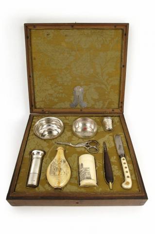 Circumcision in Judaism, known in Hebrew as brit milah (the two words meaning “covenant” and “cut”), originates in the biblical texts of Genesis and symbolizes the covenant promised by God to Abraham and the people of Israel. To constitute a sign of belonging to the Jewish religion, it must be performed at home or in the synagogue by a mohel, a voluntary officiant, today generally a member of the medical world, on the eighth day after the birth of the boy. The procedure involves removing the foreskin, exposing the glans, drawing a minimal amount of blood and reciting a blessing. This rite of passage, which marks the child’s entry into the community, must take place in the presence of ten adult men and possibly a rabbi. This box contains all the instruments needed by the mohel to perform a circumcision, including a scalpel, scissors, cups and bowls, a box and a pourer for talcum powder.