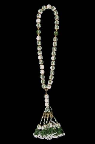 In many religions and denominations, such as Catholicism, Orthodoxy and Buddhism, rosaries are used to help believers pray, with the beads used to count the number of prayers or invocations recited. In Islam, the rosary, known in Arabic as misbaha or sabha, supports the recitation of the 99 names of God. Indeed, in addition to the name Allah, other names quoted in the Koran or in the Hadiths are used by Muslims to qualify the divinity (The Clairvoyant, The Just, The Gentle, The Living, The Patient…). Generally composed of 99 or 33 grains, they can be made from a variety of materials, from the poorest, such as olive stones, to the most ornate, as in this case. This Syrian example, made by a prisoner in the early 2000s, has the name of Allah engraved on each of the grains.