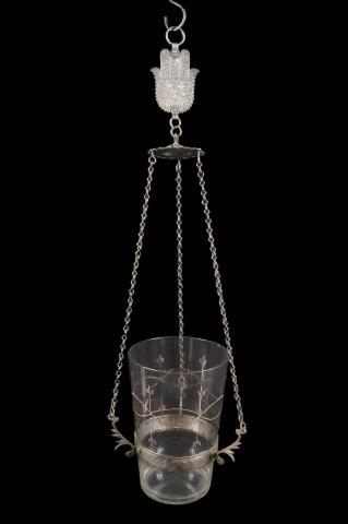 Hanging in strict alignment in the side of synagogues, lamps of this type, sometimes called “memorial lamps”, were given by the family of a deceased person and lit in their memory. The name of the deceased could be written on the lamp’s glass vessel. Two lighting methods were possible: either the container was filled with oil in which lit wicks were immersed, or it contained water on the surface of which pilot lights were floated.