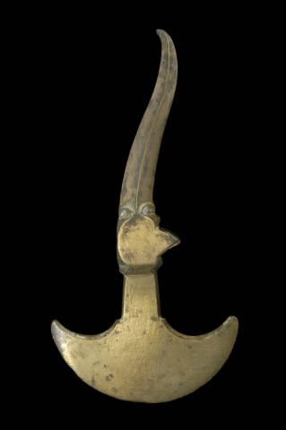 The axe is an attribute of Abu Muslim (d. 755), the general who overthrew the Umayyad dynasty, and who became a hero in Iran from the Safavid period (16th – first third of the 18th century) and a model for certain Sufi brotherhoods. It is said to have been forged from a piece of Imam Ali’s sword. Although the axe was originally a means of defense for dervishes traveling on foot, this ceremonial hatchet is above all part of the dervish’s symbolic paraphernalia, reflecting his desire to cut himself off from reality, to detach himself from the world and see only God.