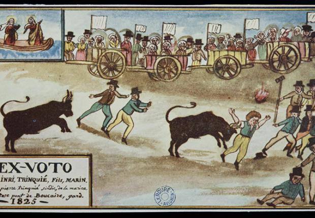 An ex-voto is an object offered in request or thanks for a grace granted by God or a holy intercessor. Painted ex-votos appeared in the 17th century. They generally consist of two registers: the lower, earthly register depicting the accident and miraculous rescue of the believer, and the upper register depicting the divine or holy apparition that made the rescue possible. In the foreground, this ex-voto shows a bullfight in which one of the participants is gored before the eyes of the crowd of spectators and other participants. In the upper left-hand corner, two saints are shown in a boat. These are probably the disciples of Jesus, St. Mary Jacob and St. Mary Salome, who arrived by boat in the Rhone delta after being expelled from Palestine. Remaining in the region, they were buried at Saintes-Maries-de-la-Mer, in the Camargue region, not far from Beaucaire, from which the unfortunate accident victim pictured originates.