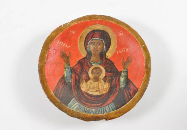 The depiction of the Virgin Mary on this dish is reminiscent of the iconography of the Virgin Mary of the Blachernes, or Blachernitissa, named after the Constantinople church where an icon of the Virgin Mary praying (hands facing heaven) with the Child on her breast is preserved in a medallion. She wears a blue dress (the color of humanity) under a red cloak (the color of divinity), thus echoing the chromatic codes widespread in iconic art.