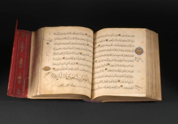 The Koran (from the Arabic for “recitation”) is the sacred founding text of the Muslim religion. It is made up of 6236 verses and 114 suras or chapters, and gathers together the words that God addressed to the prophet Muhammad through the angel Jibril (Gabriel), Revelation. This revelation was transmitted by the angel to Muhammad over a period of twenty-three years. For Muslim believers, the text of the Koran, written in the language of the Prophet, Arabic, has undergone no change since Revelation. It therefore reproduces exactly the words that the angel Jibril transmitted to the Prophet, hence its sacred nature. The sanctity of the Book requires a certain amount of care and attention. Koran holders can be used to keep the book open while it is being read, and to prevent it from being placed on the ground. The importance of the divine word is also reflected in the care taken in decorating the Koran. Since figurative representation is generally not permitted in Sunni Islam, the decoration, as in this case, uses abstract motifs and the art of writing, calligraphy, as a means of magnifying the divine word.