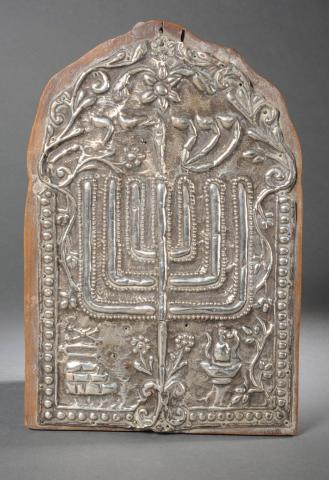 Mezuzot are among the most important devotional objects in everyday Jewish life. Mezuzah cases, made of wood or metal and generally measuring between 5 and 15 cm in height, enclose a small parchment scroll inscribed with two passages from Deuteronomy (VI 4-9 and XI 13-21). These must be written to strict standards: 22 lines, inscribed from memory and not copied. Fixing the case to the doorframe must also follow precise rules: it must be positioned at an angle, with the top facing inwards and the bottom facing outwards. The mezuzah is touched each time it passes through the door. This gesture of protection is accompanied by the recitation of a short prayer. This example is particularly ornate: it features the candlestick and crockery from the Temple of Jerusalem, built by King David’s son Solomon and the most important holy place in Judaism.