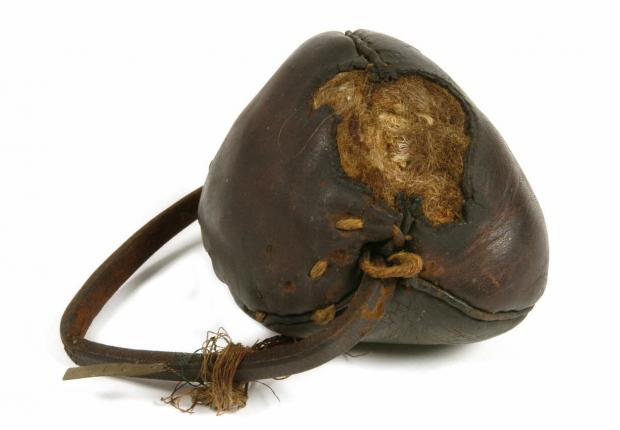 La balle de soule présentée ici a été collectée dans l’Oise, au milieu des années 1960. Les hommes se disputaient alors ce petit ballon de cuir lors du jeu de soule dont le principe de base est de porter le ballon, appelé soule ou pelote, au-delà d’une ligne, ou de le ramener d’un camp dans un autre, voire d’un village dans le voisin. Il s’agit d’un jeu de ballon avec mêlée massive. La confrontation des deux camps rivaux traduit l’opposition entre deux territoires. En se disputant le ballon, c’est l’identité du village ou du groupe auquel on appartient que l’on défend.