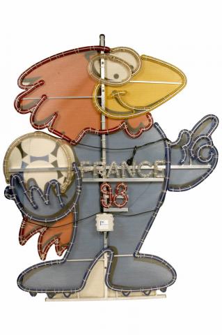 La Coupe du Monde de football est l’évènement sportif le plus populaire. Les meilleures équipes du monde entier s’affrontent tous les quatre ans, depuis 1930, pour remporter le trophée qui consacrera la suprématie d’une d’entre elles. Au-delà de la compétition sportive se déroule également toute une mise en scène de l’évènement dans laquelle s’organise une stratégie de communication à l’échelle planétaire. Lors du Mondial 1998, le comité français d’organisation de la Coupe du Monde a choisi « Footix » pour représenter la France, pays hôte de la compétition. Ce souriant coq en crampons, vêtu de bleu et dessiné par le graphiste Fabrice Pialot, s’est retrouvé représenté sur de multiples créations graphiques, vestimentaires, artistiques et commerciales, acquises par le Mucem en 1998 pour témoigner matériellement de la mémoire de cet évènement. Sur cette enseigne lumineuse aux dimensions imposantes, Footix tient un ballon dans son aile droite et lève « l’index » de son aile gauche, en guise d’invitation au jeu.