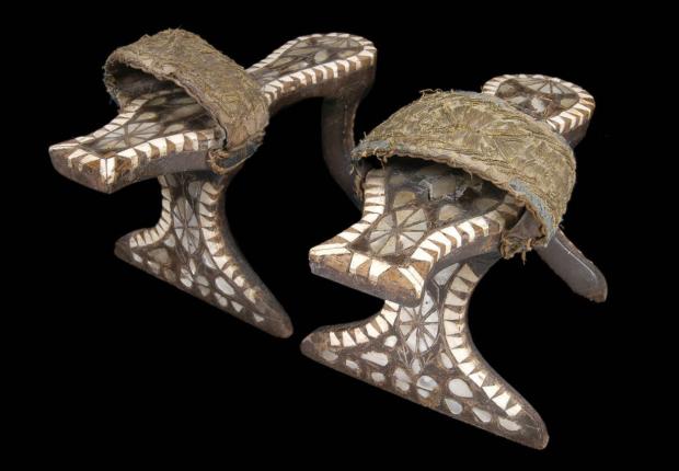 Au-delà de la dimension religieuse, le hammam est aussi un lieu de détente, de plaisir et de conversation, un lieu social où l’on se rencontre, où le barbier opère et donne des massages. C’est aussi un lieu de déploiement des apparences où les femmes ont l’occasion de se montrer entre elles. C’est pourquoi certaines sandales sont ornées de nacres ou de fils d’or comme cette paire du 19ème siècle, dont la forme correspond à un modèle turc utilisé en Algérie et dans tous les pays ayant été sous domination ottomane.