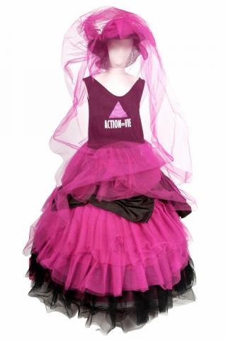 Cette « robe de marié(e) » a été confectionnée pour être portée par l’un des membres du couple homosexuel défilant en tête de cortège de l’association Act Up-Paris , à l’occasion de la 27e édition de la marche des fiertés lesbiennes, gaies, bi- et transsexuelles (la Gay Pride), à Paris, en 2004. Ce costume de marié(e) s’inscrit dans une tradition carnavalesque de subversion des codes vestimentaires et d’inversion des genres. Ses couleurs, qui sont aussi celles de l’association, tranchent avec la norme du blanc nuptial : le noir du deuil est choisi en mémoire des victimes de l’épidémie de sida et le triangle rose reprend en l’inversant la stigmatisation de l’homosexualité dans les camps d’extermination nazis. En plus de la robe et de la coiffe, ce costume est complété par un tee-shirt qui porte un des slogans fondateurs de l’association : action = vie.