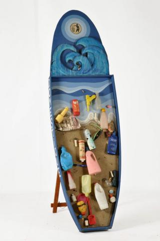 Cet objet, reprenant la forme d’une planche de surf, est constitué de divers déchets ramassés sur une plage. En partie supérieure, est peint en bleu et blanc le logo présentant un personnage jetant un objet dans une poubelle. En dessous, la représentation de la mer est symbolisée par des vagues en carton, dans lesquelles évolue un surfer.