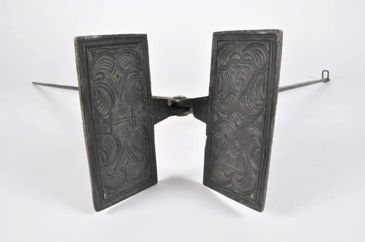 Fer forgé, moulé et gravé, un rivet permet l'articulation des branches, la queue d'une branche est terminée par une boucle fermée sur un anneau allongé / Gaufrier avec deux branches rectangulaires en fer forgé terminées par deux plaques rectangulaires en fonte rivetées aux branches et subdivisées en deux panneaux rectangulaires.