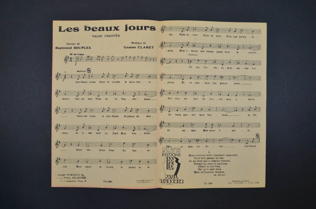 Sur la couverture, le portrait photographique de Tino Rossi inscrit dans une représentation de la carte de France. Les inscriptions renseignent le titre de la chanson, le nom des auteurs, de l'artiste et de l'éditeur. A l'intérieur, partition et paroles de la chanson. Au dos, liste d'autres partitions publiées par l'éditeur.Matériaux et techniques