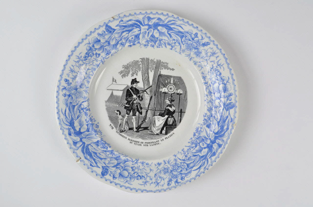 Faïence fine moulée à décor imprimé en bleu et noir, à glaçure transparente, poinçon au verso / Sur plan circulaire à Marli découpé orné de fleurs et bordé d'une ligne de perles, à médaillon central : un homme en tenue de chasse, avec son chien se prépare à tirer à tirer à un stand de tir tenu par une femme assise. Inscription : " n. 8, chasseur parisien se procurant le plaisir de tirer des lapins". poinçon au verso : " Creil-et-Montereau, médailles d'or 1834, 39, 44 et 49, l. M et cie, porcel. Opaque".Décor