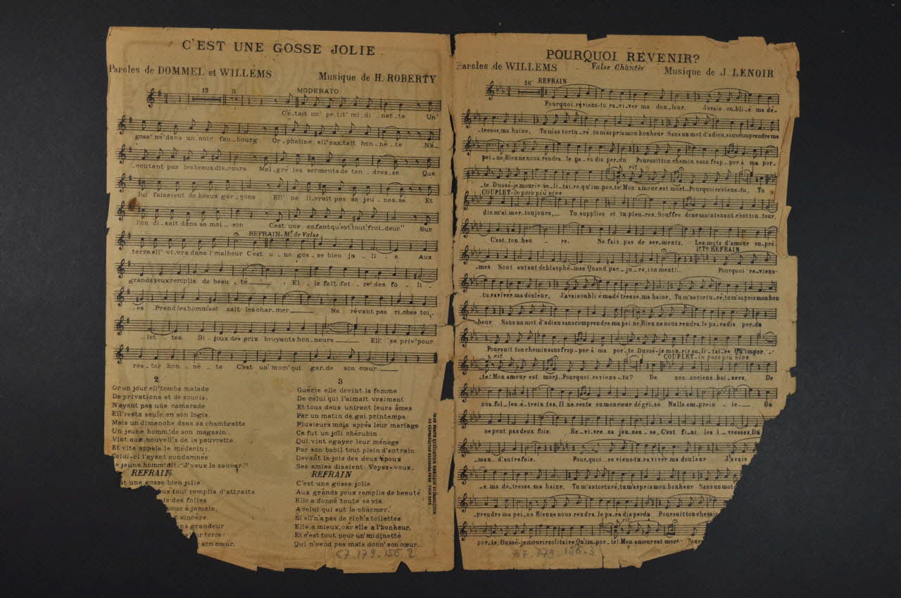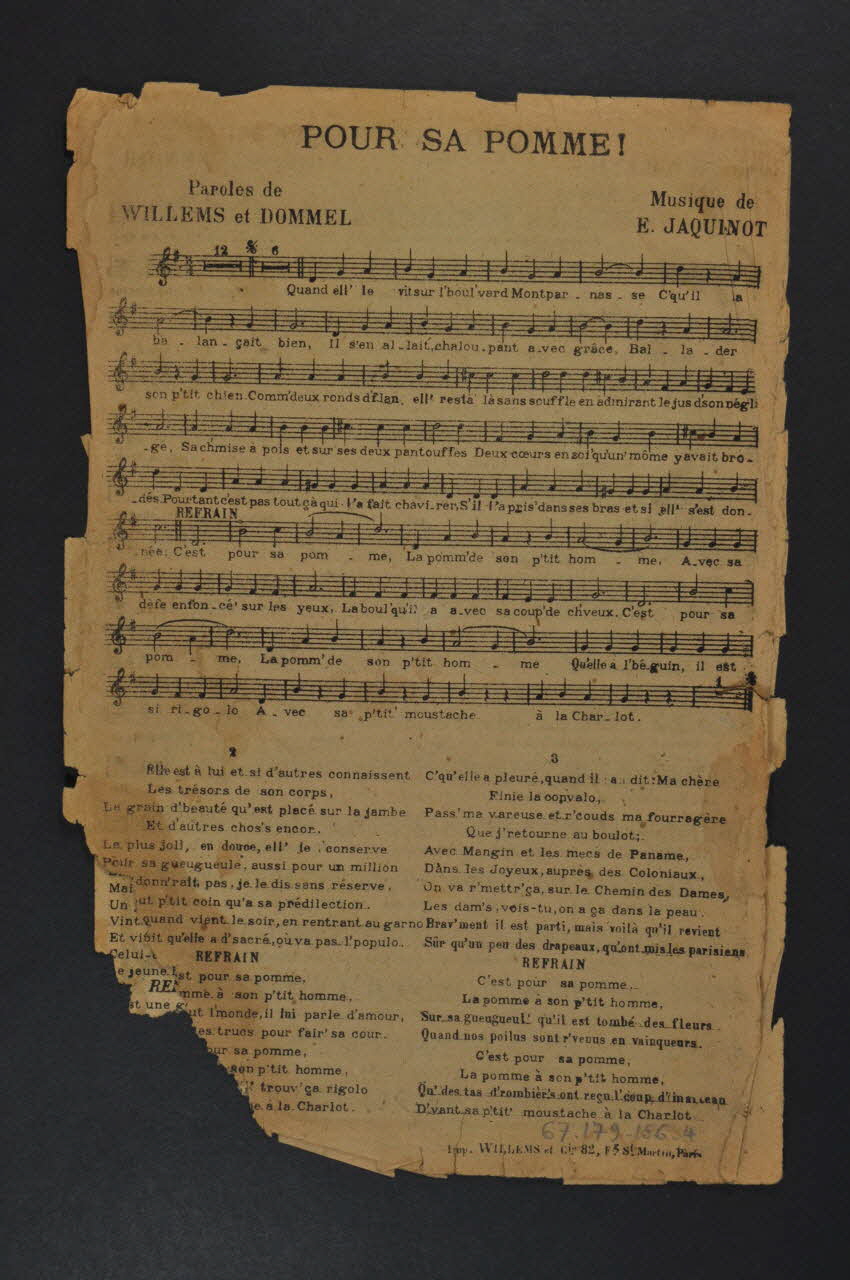 Les inscriptions renseignent le titre de la chanson, le nom des auteurs, de l'artiste et de l'éditeur. A l'intérieur et au dos, les partitions et les paroles.Matériaux et techniques