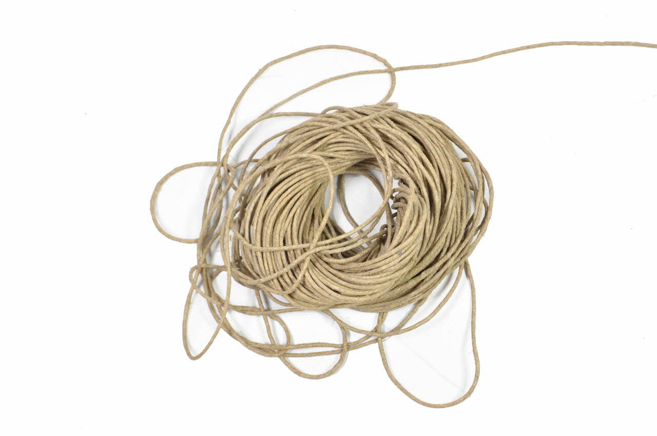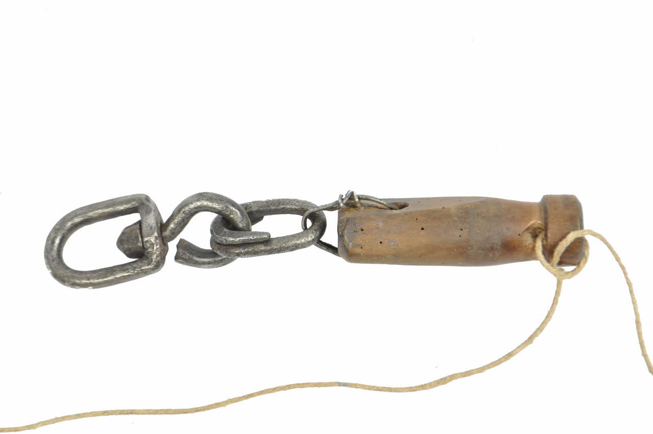 La corde 1965.55.61.2.1 est plus épaisse que la corde 1965.55.61.2.2 et est attachée sur l'extrémité de la perche opposée à celle qui reçoit la planchette en bois. La corde 1965.55.61.2.2 est attachée à la corde 1965.55.61.2.2 et sur sa partie centrale elle reçoit un bobino en bois de forme cylindrique. La partie supérieure de celui-ci est chanfreinée et perforée verticalement au centre de son extrémité, le trou ressort d'un des côtés de la partie chanfreinée. Sa partie inférieure présente deux méplats de part et d'autre traversés par une perforation horizontale afin de laisser passer un anneau composé par un fil de fer triplé qui accroche un émerillon en fer moulé. Ce dernier est composé d'une maille fermée de forme ovale, d'une maille ouverte formant un crochet auquel s'attache la partie finale de l'émerillon. Ancienne description de la fiche 1965.55.65. 1965.55.61.2.2 : Corde : lien de la corde 1965.55.61.2.3 : Bobino : percé verticalement au centre d'un trou - à la partie supérieure : un chanfrein et une gorge - trou oblique de part et d'autre de la bobine - deux méplats - un anneau 1965.55.61.2.4 : Emerillon : avec une maille ouverteMatériaux et techniques