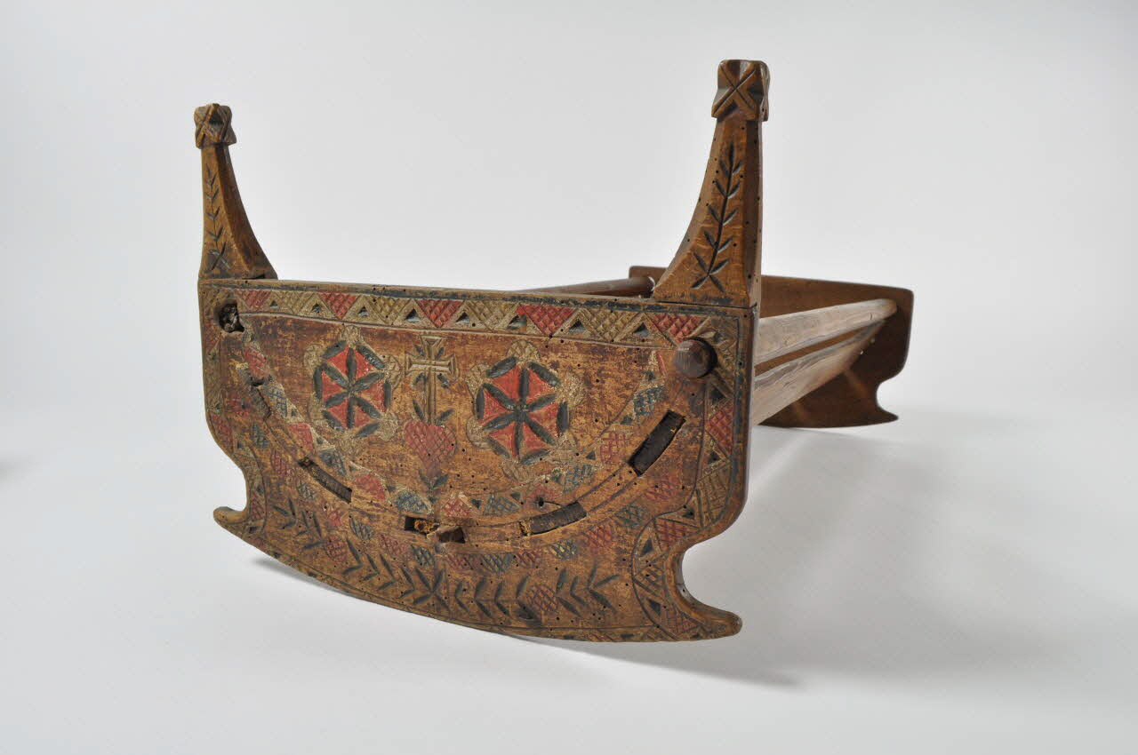 Bois résineux indigène taillé, à montants supérieurs tournés, à décor gravé, incrusté de cire rouge et noir, assemblé à tenon-batard, à enfourchement / Rectangulaire, à fond concave, formé de cinq lattes rectangulaire, et de deux barreaux en bois circulaire dans la partie supérieure. Les deux côtés sont terminés par des patins courbés, plantés de petits clous. L'un des côtés est surmonté de deux montants, ornés de rameaux, surmontés par des petits cubes gravés de croix. Il est gravé dans la partie supérieure d'un coeur et d'une croix, entourés de rosaces, et de rameaux dans la partie inférieure. L'autre côté est gravé d'une rosace entourée d'une couronne végétale, soulignée de frises de motifs géométriques. Les motifs sont inscrustés de cire rouge, bleue et blanche.