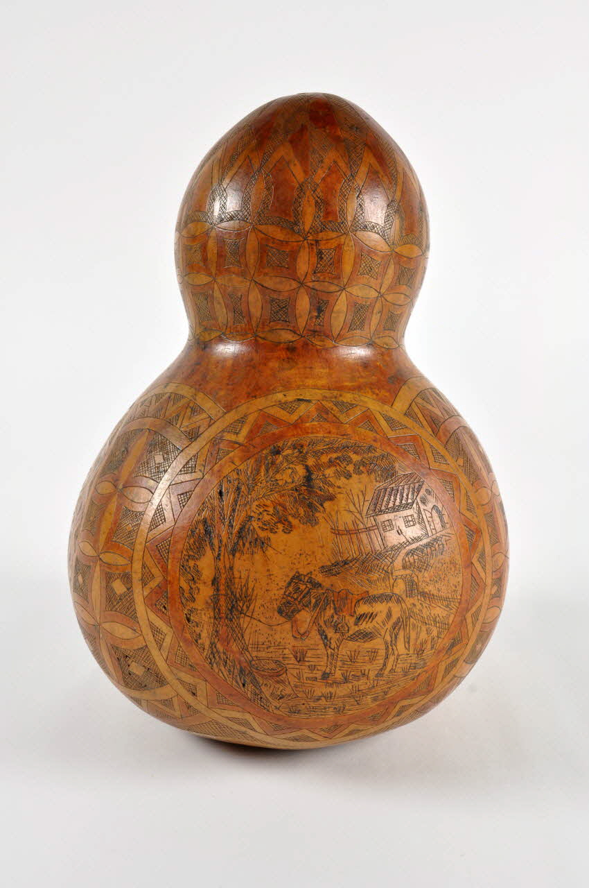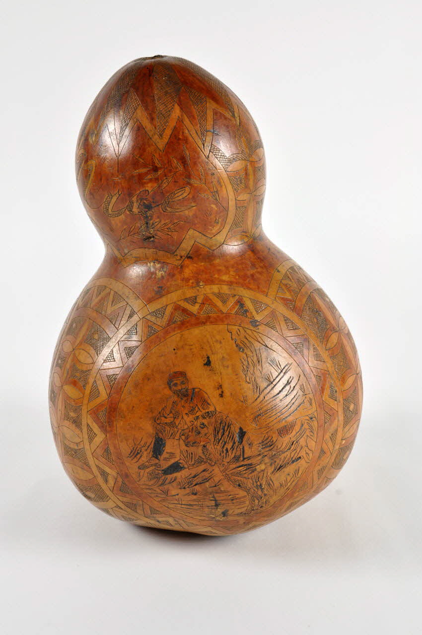 Calebasse à deux panses sphériques superposées gravée d'un décor. Trois scènes dans des cercles gravées en noir avec des réhauts de couleur rouge.