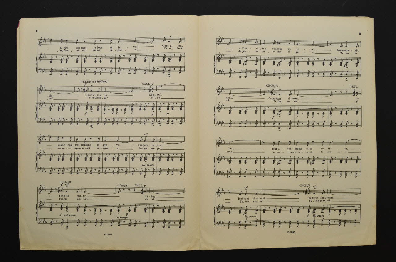 Partitino composée de deux feuillets rectangulaire en papier industriel imprimé à l'encre noire ; la couverture et le dos, sur le premier feuillet, sont imprimés à l'encre rose.