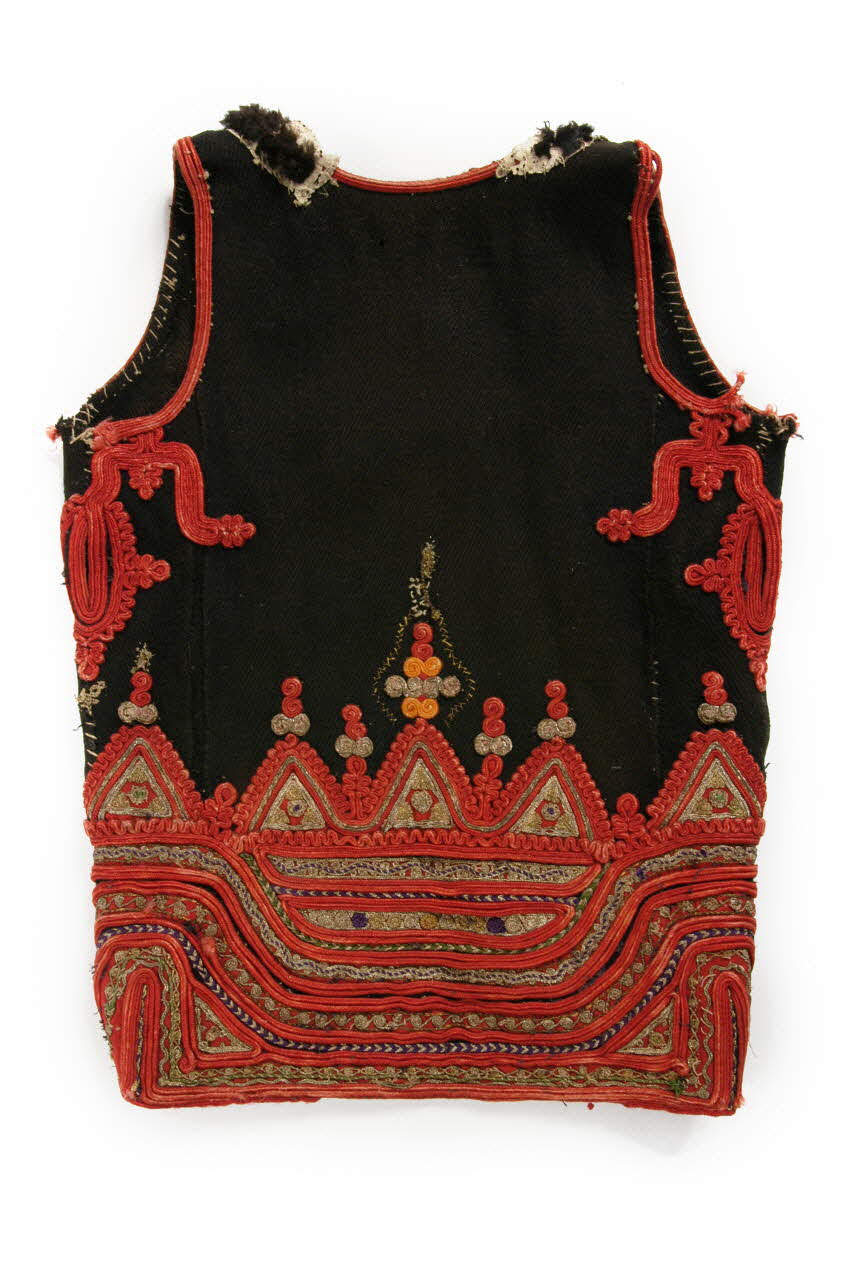 paletot en laine noire tissée, broderies de laine rouge et de fils d'or, col en fourrure noire / paletot de femme noir, décoré de soutaches rouges et doréesMatériaux et techniques