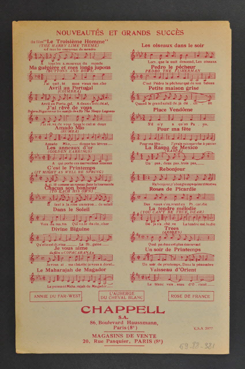 Des inscriptions renseignent le titre, les auteurs, les exécutants et l'éditeur. A l'intérieur, partition et paroles de la chanson. Au dos, liste d'autres partitions publiées par l'éditeur.Matériaux et techniques
