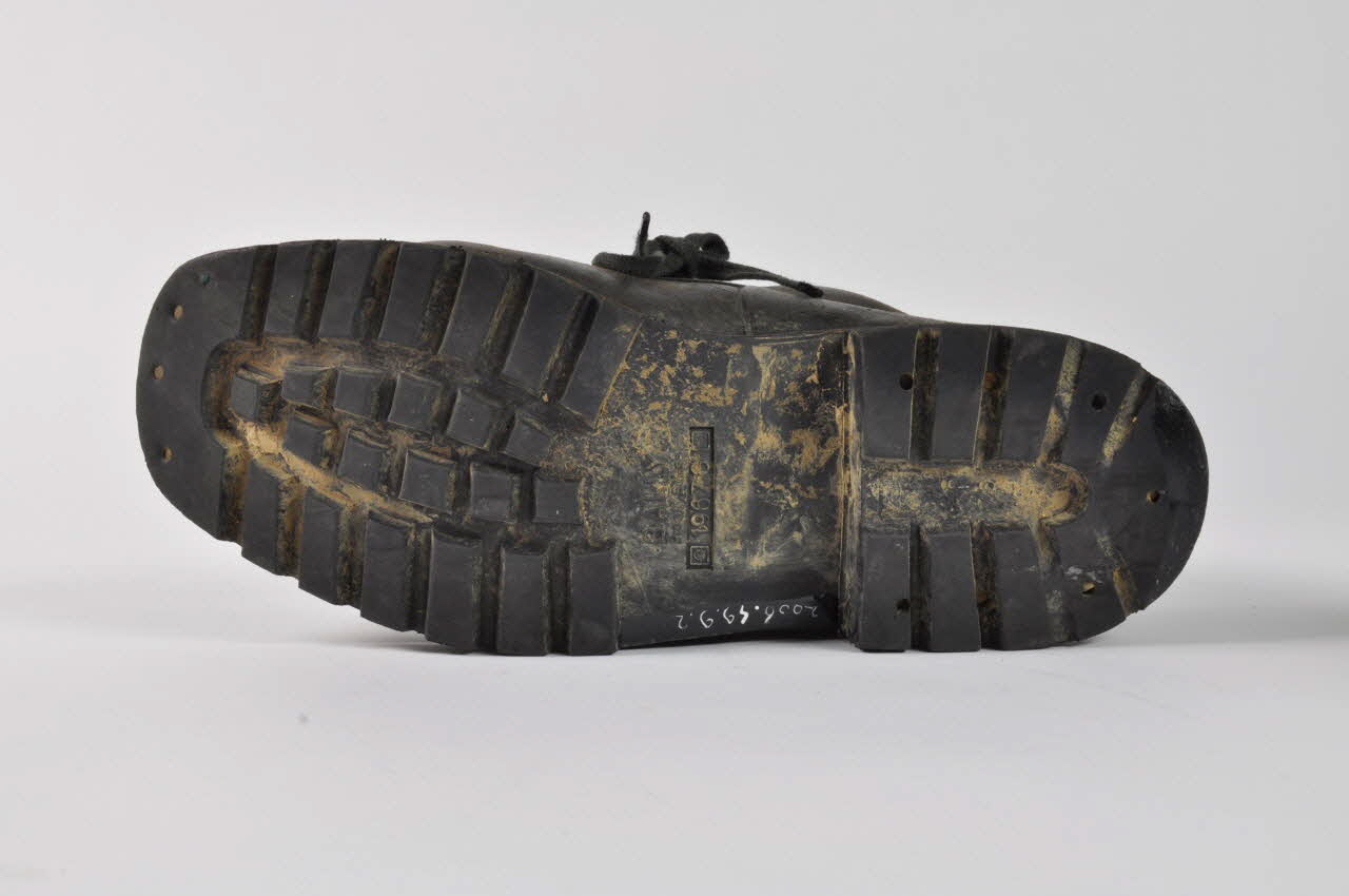 Ces chaussures sont montantes avec lacets sur la droite et douze crochets par chaussure. Les deuxième lacets se trouvent au fond de la chaussure droite. Doublures en cuir. Inscription à l'intérieur.Matériaux et techniques