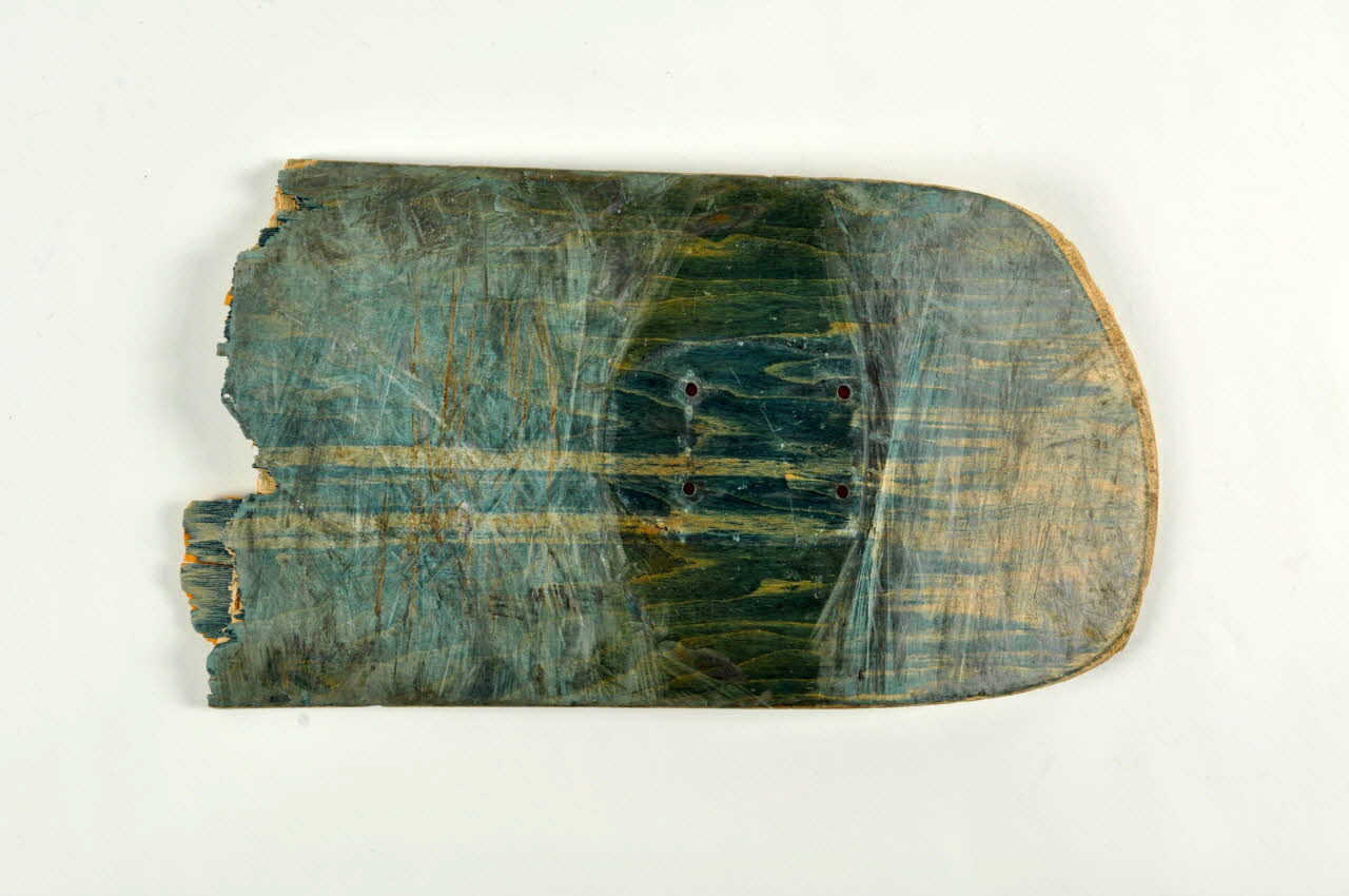 Fragment de planche en bois composée de sept fines couches de bois d'érable canadien, collées et placées sous une presse. A l'avant, quatre trous pour la fixation de l'essieu.