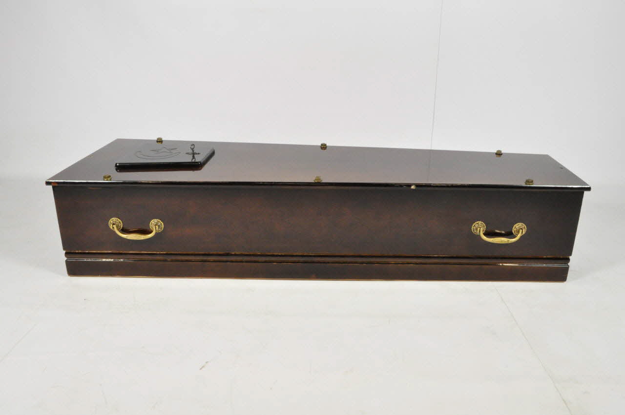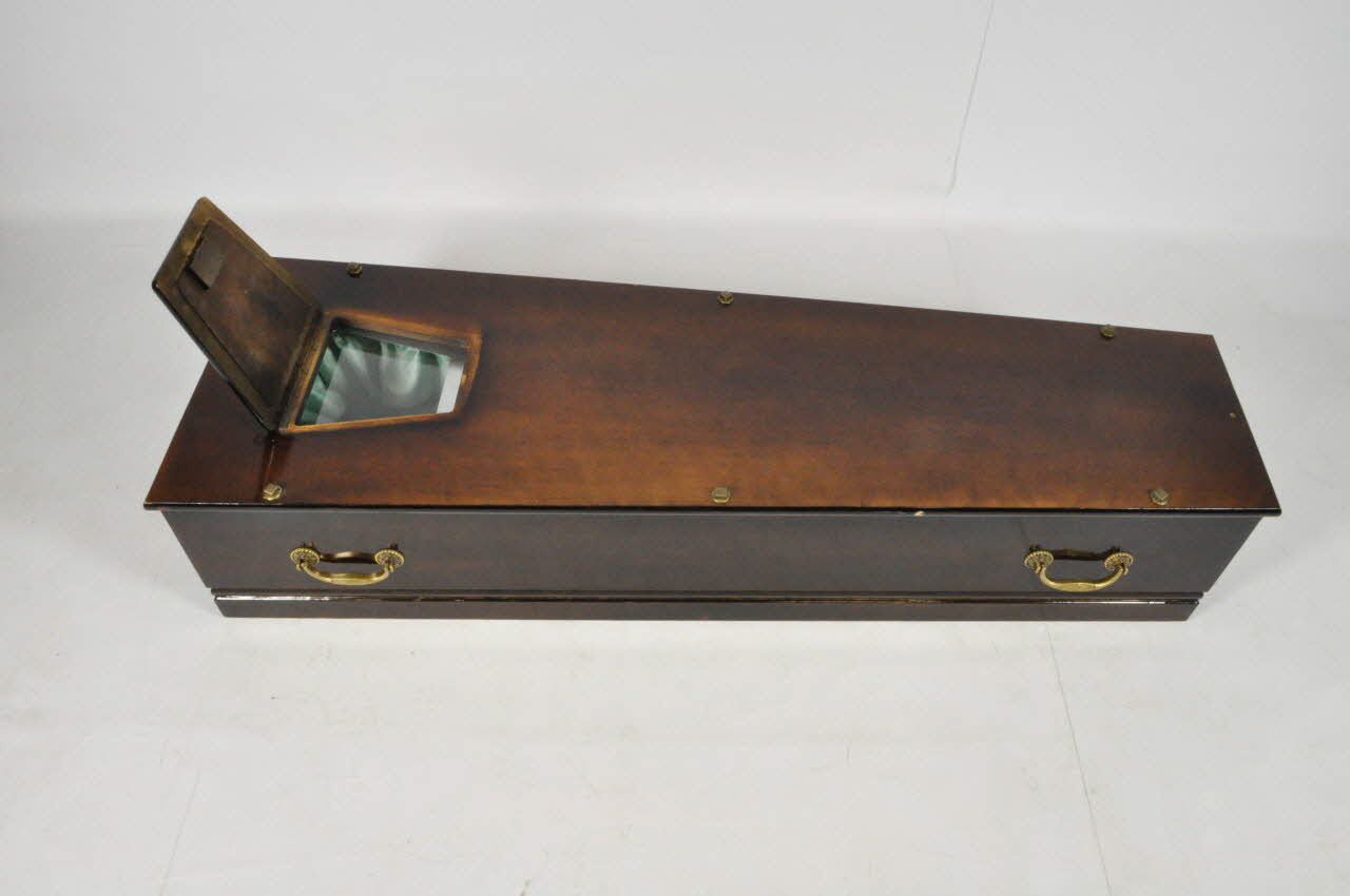 Cercueil musulman de forme trapézoïdale, présentant une "fenêtre" à volet, destiné au transport des corps des défunts. La fenêtre sur la partie supérieure permet d'identifier le corps. Elle se ferme par un clapet trapézoïdal en bois vernis à charnière et serrure en fer présentant des symboles musulmans gravés: le croissant présentant le chemin à parcourir pour accéder au paradis et l'étoile représentant les cinq piliers de l'Islam. L'intérieur du cercueil est capitonné et doublé d'un tissu de soie bleu froncé. Le cercueil s'ouvre par un système de boulons en laiton. On trouve trois boulons le long des bords latéraux. Une clé en acier permet de fermer de clapet. Sur chaque côté latéral, deux poignées moulurées et mobiles en laiton.Matériaux et techniques