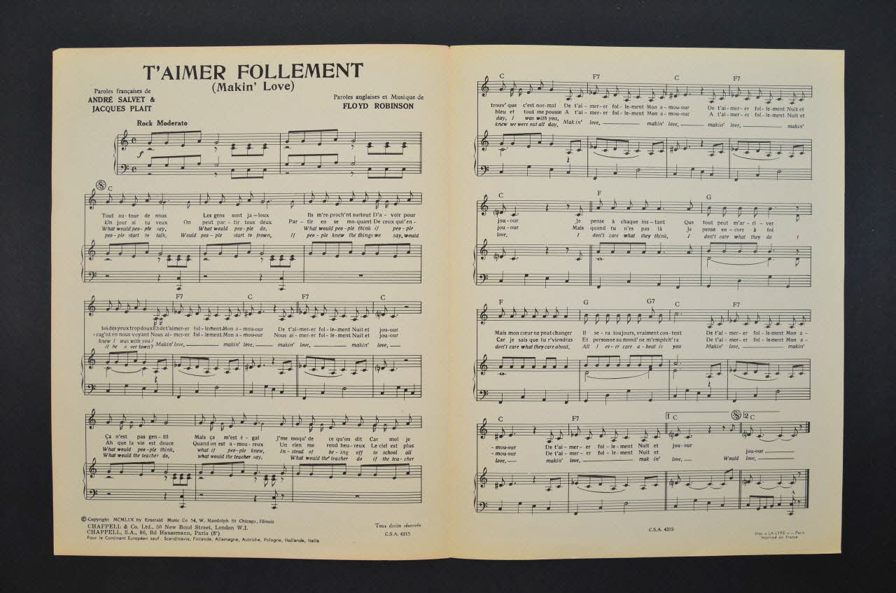 Sur la couverture, les portraits photographiques de Dalida, Bob Azzam et le groupe Les Riff. Les inscriptions renseignent le titre de la chanson, le nom des auteurs, des artistes et de l'éditeur. A l'intérieur, partition et paroles de la chanson. Au dos, liste d'autres partitions publiées par l'éditeur.Matériaux et techniques