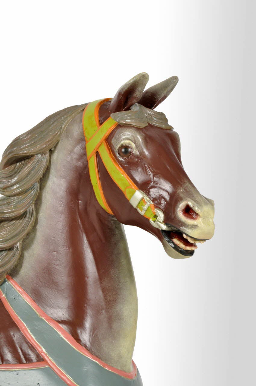 Cheval sauteur en bois peint en brun et taché gris, appartenant au Manège de Nogent.