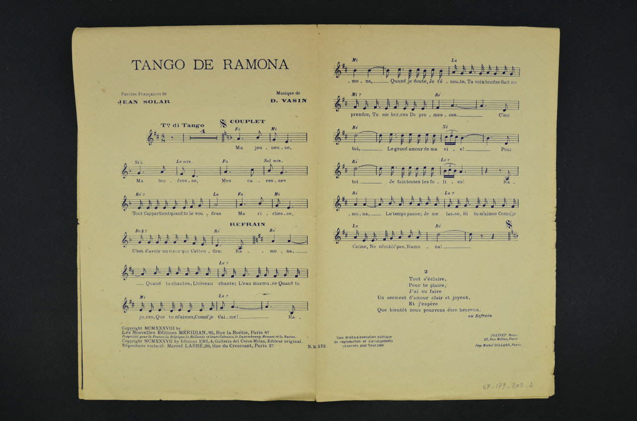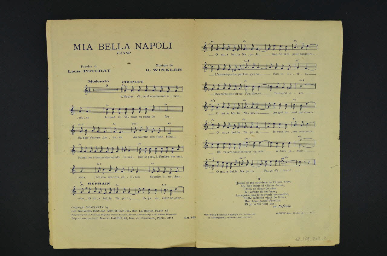 Les inscriptions précisent l'auteur de la chanson, les interprètes et l'éditeur du feuillet. L'intérieur et le dos comportent la partition et les paroles.Matériaux et techniques