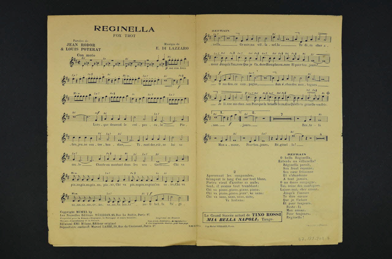 Feuillet rectangulaire imprimé sur papier industriel à l'encre bleue. La première page présente le portrait de Tino Rossi.