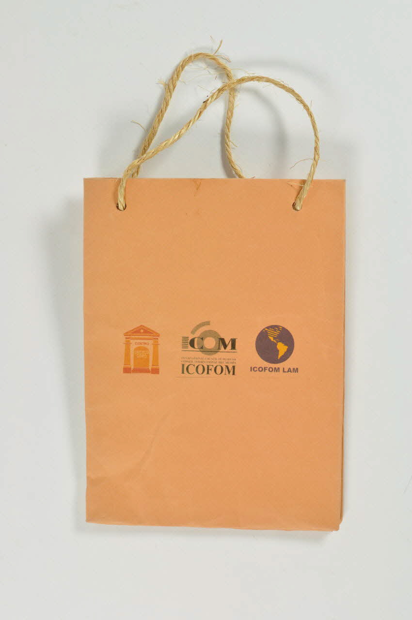 En papier, de forme rectangulaire à fond orange avec des soufflets pliables dessous et sur les côtés. Les poignées sont en corde nouée. Inscriptions en noir sauf le dessin, représentant une mappemonde, marron et bleu. A l'arrière du sac, un logo représentant l'avant d'un temple en orange, un logo avec des inscriptions noires et un logo en forme de planète terre bleu et jaune.Inscriptions