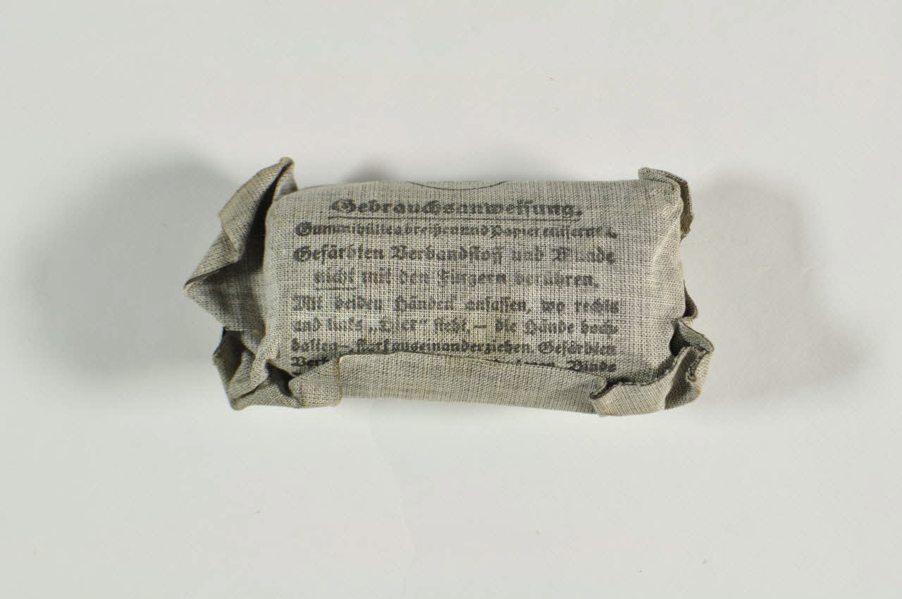 Compresses contenues dans un emballage en toile de coton beige portant des inscriptions typographiées noires en allemand sur ses deux faces principales.Inscriptions