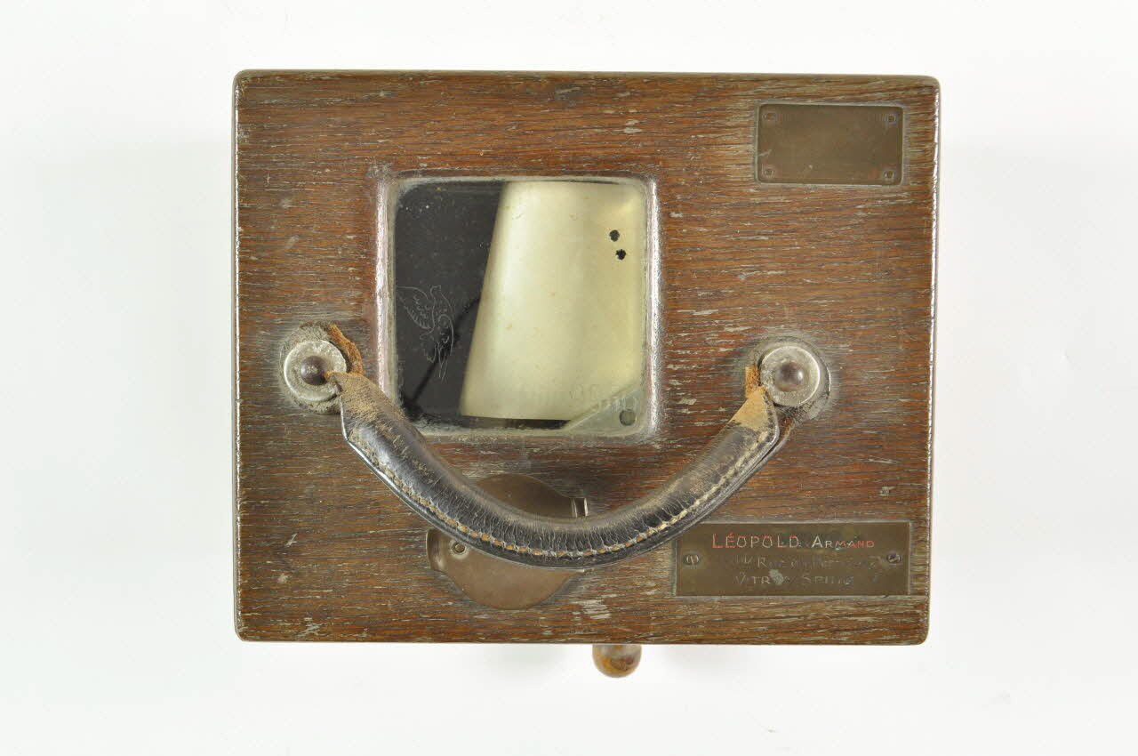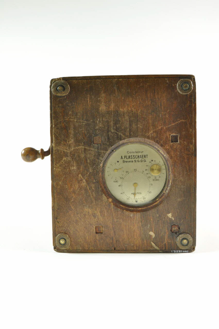 CONSTATEUR-IMPRIMEUR / A PLASSCHAERT / BREVETE S.G.D.G. / N°9966 / ROSOOR-DELATTRE / Propriétaire des brevets français / Editeur-fondateur de la "Revue Colombophile" / TOURCOING-NORD (Fixée sur le côté de la boîte.), couvercleLEOPOLD ARMAND / 17 bis Rue du Perreux / VITRY S/ SEINETampon