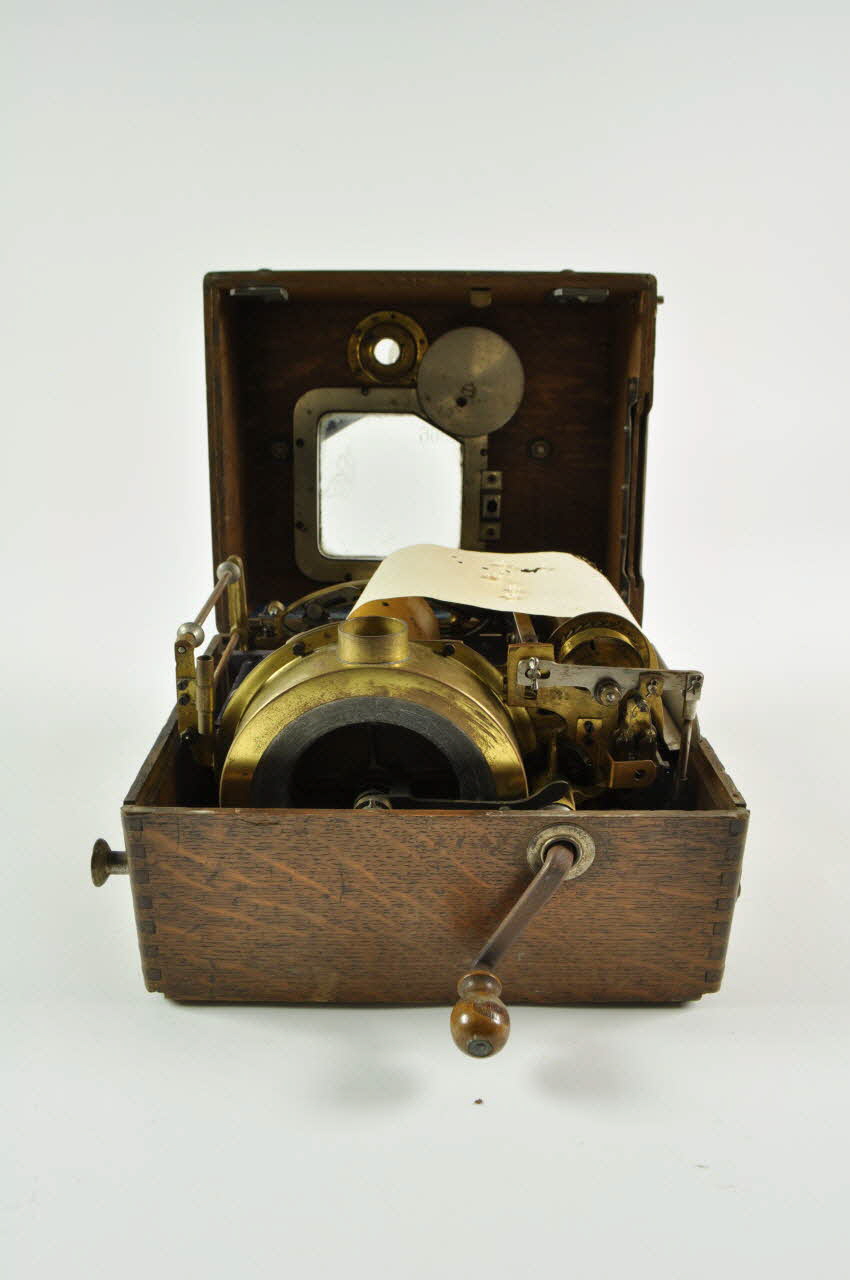 L'ensemble est rangé dans une boîte en bois, et actionné par une manivelle à petite poignée en bois tourné, sortant de l'un des côtés de la boîte. Le couvercle de la boîte, retenu par deux charnières, est muni de deux crochets de fixation, s'ouvrant par l'action d'un bouton-poussoir situé sur un côté de la boîte. Le couvercle présente une petite vitre, surmontée d'une poignée en cuir, et deux petites plaques de cuivre. Une plaque métallique, gravée de nombreuses inscriptions encadrées de motifs stylisés, est fixée sur l'un des côtés de la boîte. Sous la boîte, sous une plaque de verre, sont disposés trois cadrans signifiant les heures, les minutes et les secondes.Inscriptions