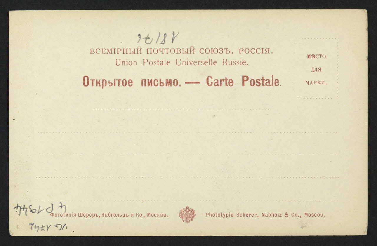 Homme debout de trois quart en tenue traditionnelle russe, posant devant un fond uni et portant sur la tête un plateau sur lequel sont posés un seau et des végétaux.Décor