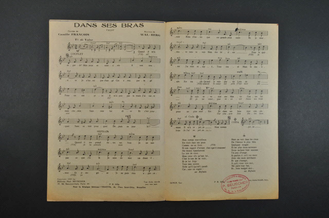 Des inscriptions renseignent le titre, les auteurs, les exécutants et l'éditeur. A l'intérieur, partition et paroles de la chanson. Au dos, une publicité de l'éditeur.Matériaux et techniques