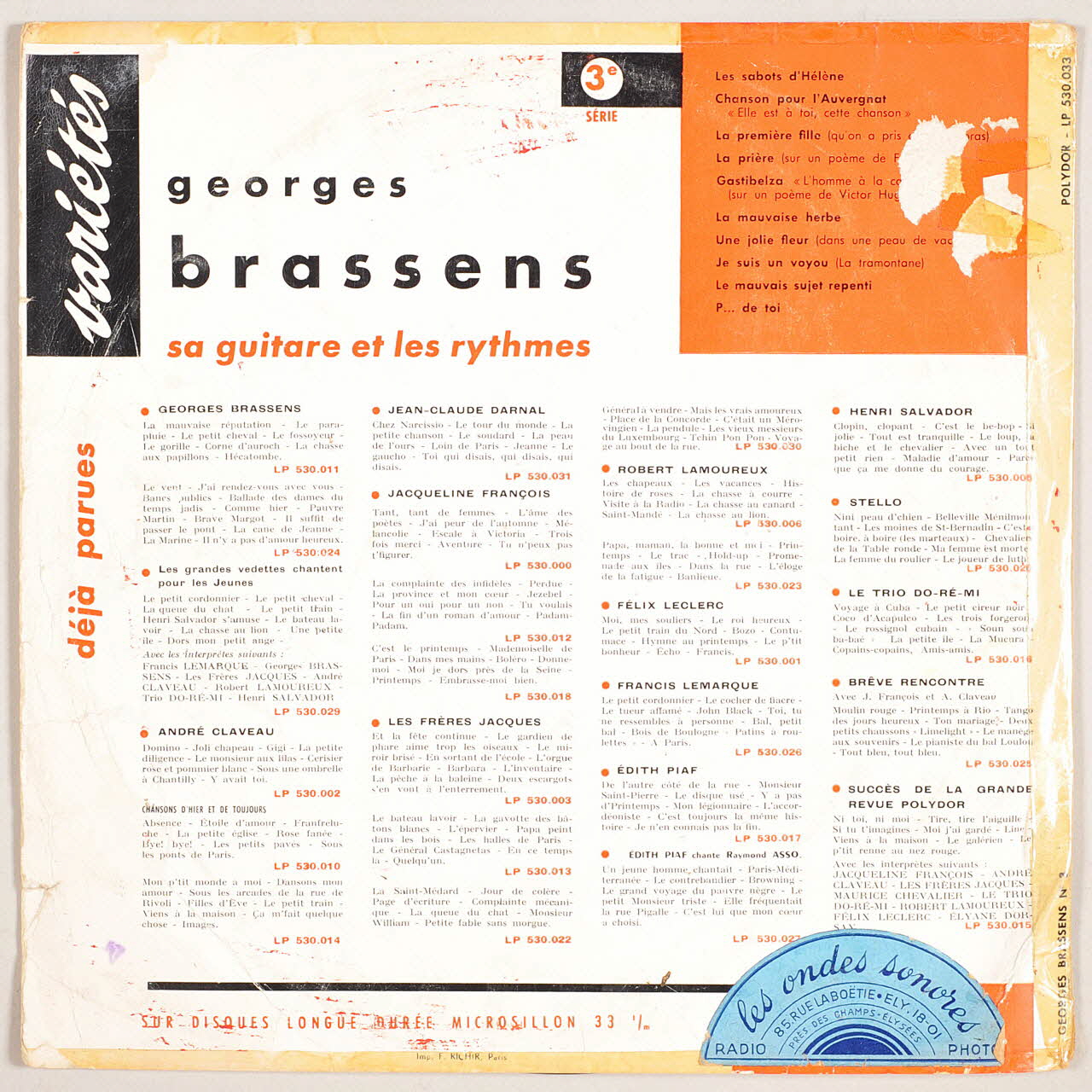 GEORGES Brassens n°3 (sur la pochette, au recto)Les ondes sonores // 85, rue de la Boëtie - Ely 18-01 // Près des Champs-Elysées // RADIO PHOTO (sur une étiquette ajoutée, au dos de la pochette)Décor
