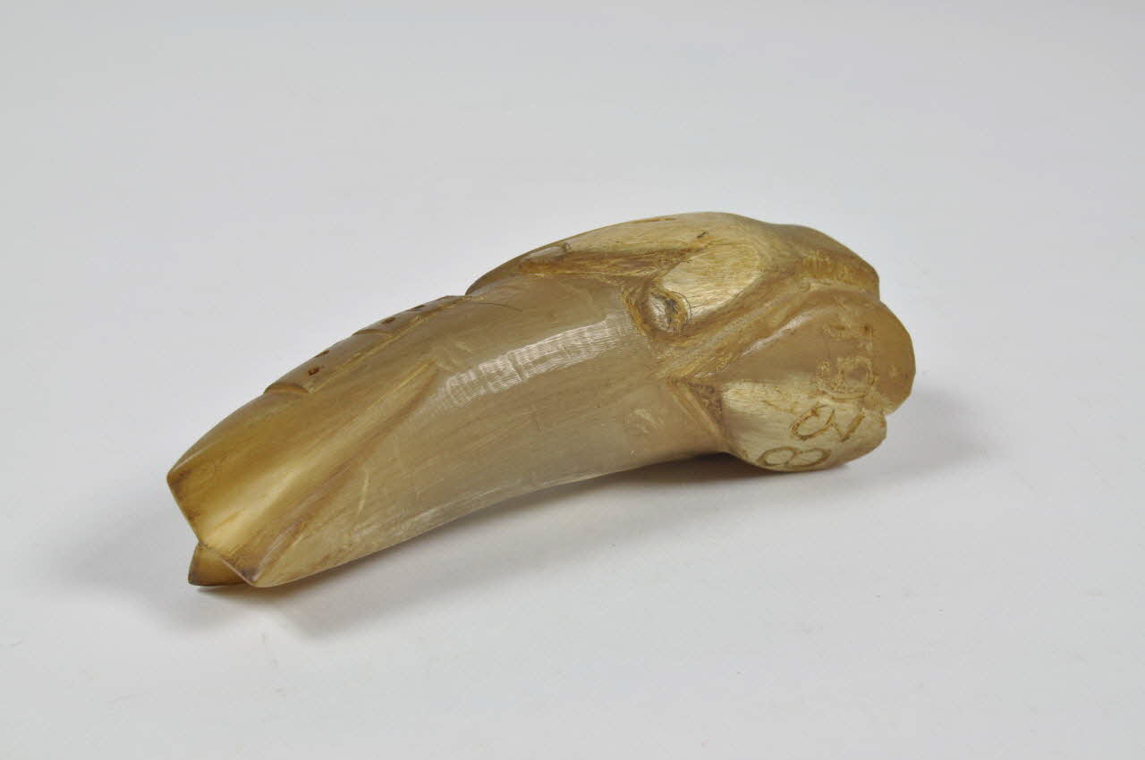 Outil à trois encoches entre lesquelles sont sculptés en relief un coeur, un fruit et un domino. Le manche est orné d'une main qui semble tenir l'outil.