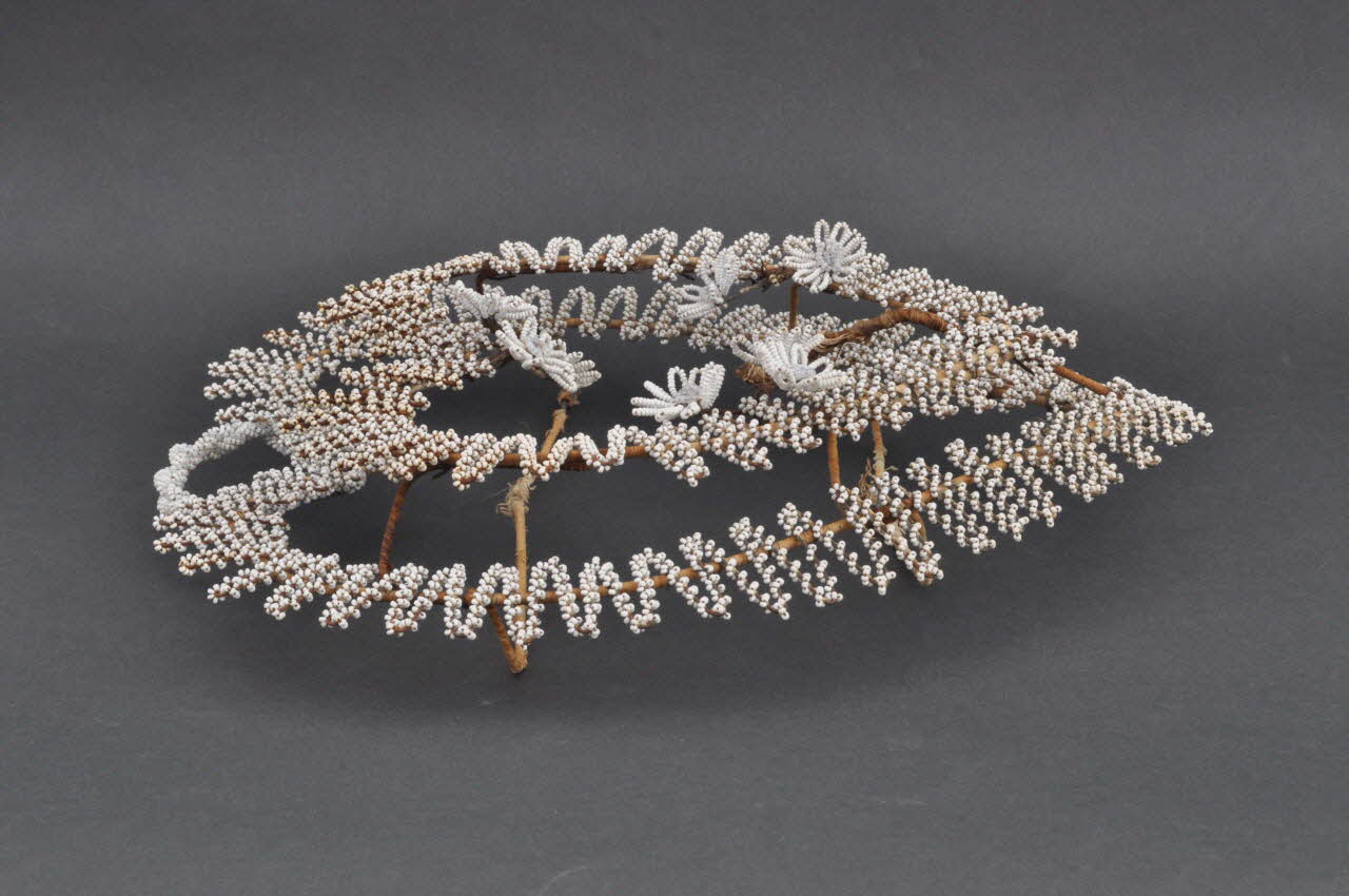 perles enfilées / entortillé / enroulé / Composition en perles de rocaille, en forme de coeur. Elle est formée d'une double armature en fils de fer, recouverts de fil de coton beige. Il s'agit de deux coeurs superposés : un plus petit en haut, et en plus grand en bas, suspendu sur deux tiges servant de pied. Chacun des coeurs est recouvert de chevrons qui sont recouverts de papier et de torsades de perles blanches. Le coeur supérieur porte un décor de trois bouquets de trois petites fleurs blanches : un en haut, au milieu, et un au centre de chacun des côtés.