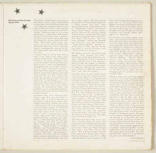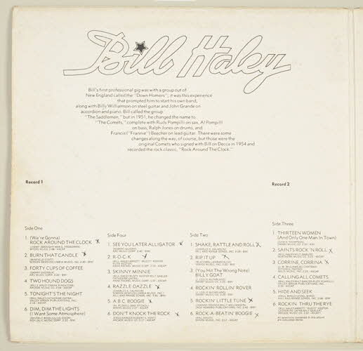 MCA 514 001/02 (référence de l'album)disque 1, face 1 : // - Rock around the clock // - Burn that candle // - Forty cups of coffee // - Two hound dogs // - Tonight's the night // - Dim, Dim the lights // // disque 1, face 4 : // - See you later alligator // - R-O-C-K // - Skinny Minnie // - Razzle - Dazzle // - A.B.C. Boogie // - Don't knock the rock // // disque 2, face 2 : // - Shake, Rattle end Roll // - Rip it up // - Billy Goat // - Rockin'Rollin'Rover // - Rockin'Little Tune // - Rock-a-Beatin'Boogie // // disque 2, face 3 : // - Thirteen women // - Saints rock'n roll // - Corrine, Corrina // - Calling all comets // - Hide and seek // - Rockin thru the rye (titre des chansons // 24 titres)Décor
