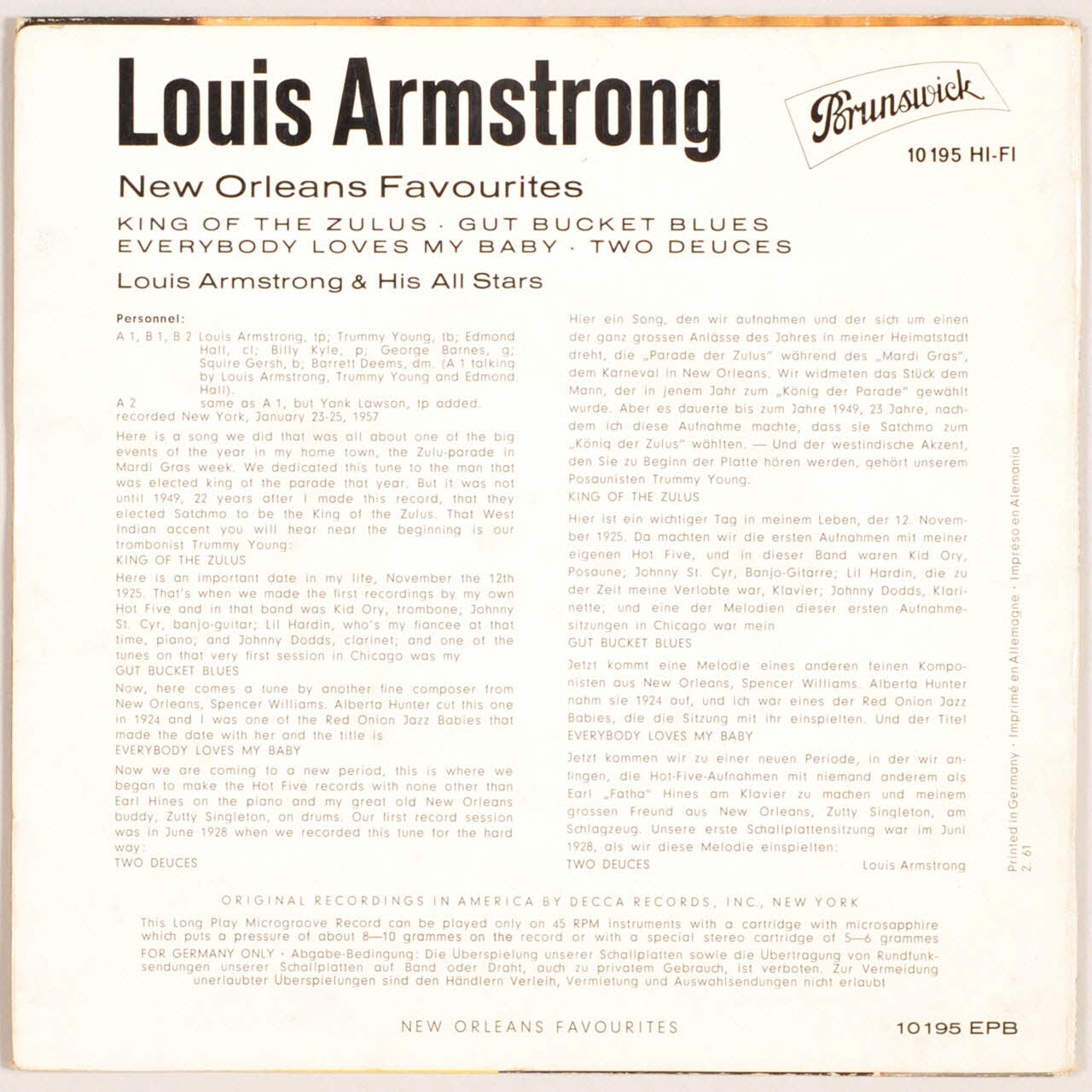 disque 45 tours, Two deuces, Gut bucket blues, King of the Zulus, New Orleans Favourites, Everybody loves my baby