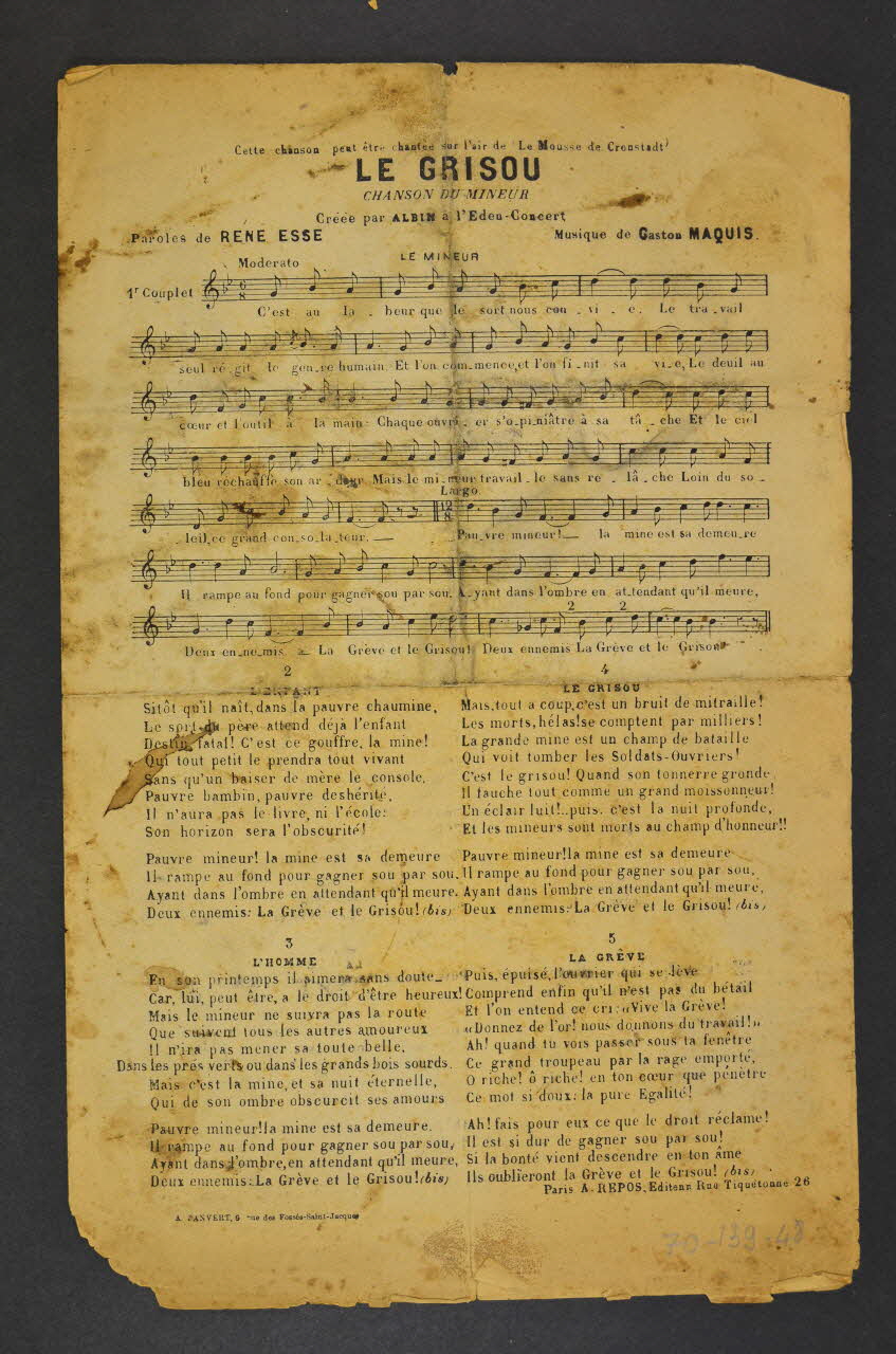 Lithographie noir et blanc / Feuillet rectangulaire en papier industriel imprimé à l'encre noire. Sur la couverture, le dessin de mineurs sortant de la mine d'où provient une explosion.