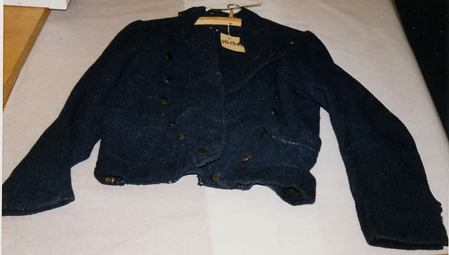 Tissu de laine, teint, sergée-croisée; à boutons en corne gravée. / Encolure pointue, col tailleur; ouverture partant de l'encolure; manches longues et ajustées; à double rangée de boutons gravés; à pointes de col boutonnées.Matériaux et techniques