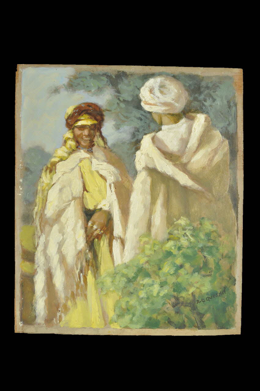 Il représente un couple de berbères en habits traditionnels : un homme de dos et une femme de face au milieu d'une riche végétation. On note des empâtements sur l'ensemble.Décor