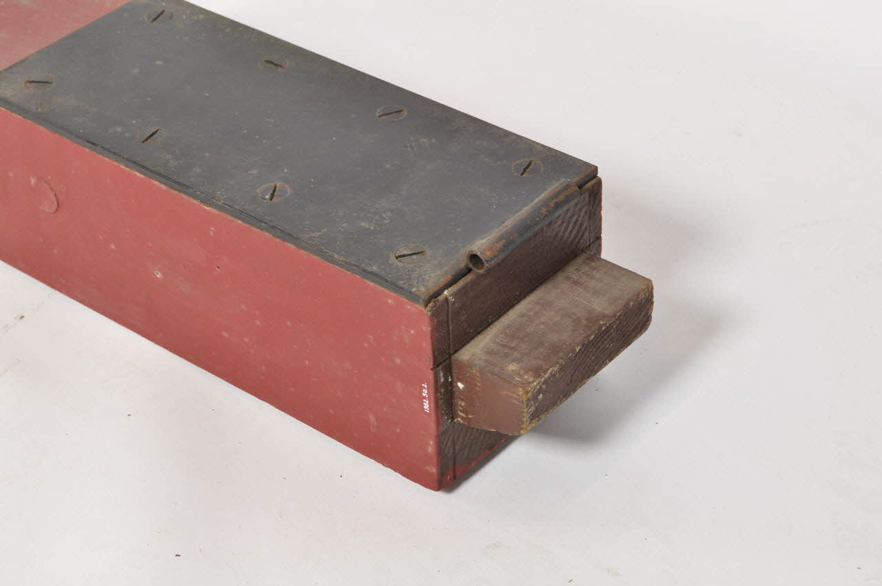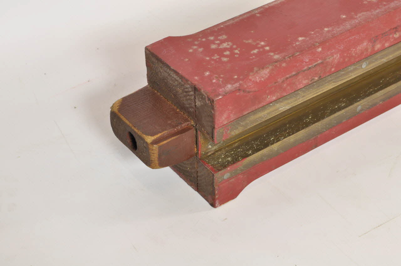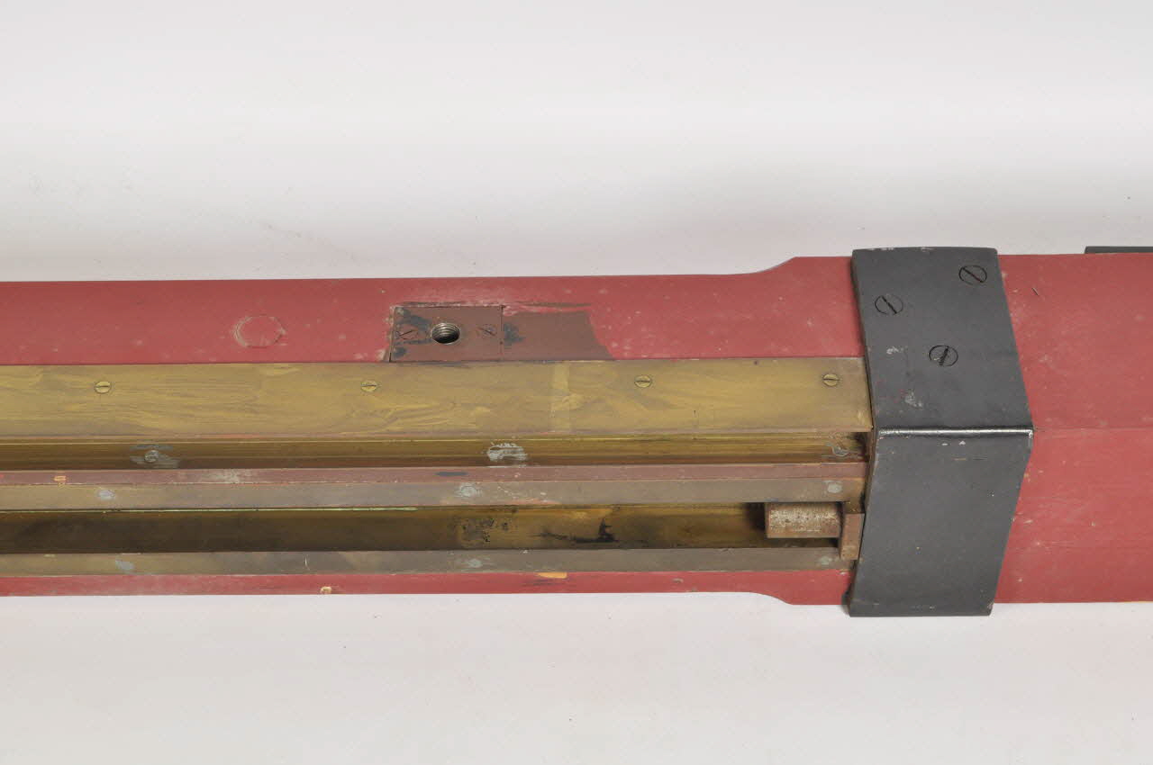 Montant vertical gauche de la guillotine, en chêne taillé et peint en rouge. A chaque extrémité, un tenon, l'un s'imbriquant à la base (1982.50.2.1) et se fixant par une charnière en fer, l'autre se fixe à la rainure (1982.50.2.12). Sur un côté, sur toute la longueur, une large rainure recouverte d'une feuille de laiton vissée, pour le passage du mouton (1982.50.1.11). A l'extrémité de la rainure, une pièce de fer à section circulaire s'imbrique dans un amortisseur pour le mouton. Parallèlement, une seconde rainure laisse coulisser les deux parties de la lunette (1982.50.2.14.1-2). A l'extrémité des rainures, une ceinture de fer peinte en noir, encadre le montant. Des trous de boulons en fer sur les côtés, afin de fixer les barres de fer (1982.50.2.3 et 1982.50.2.5) à l'avant et à l'arrière de la base (1982.50.2.1) et une barre latérale (1982.50.2.7) se fixant sur la partie inférieure de la base (1982.50.2.2).Matériaux et techniques