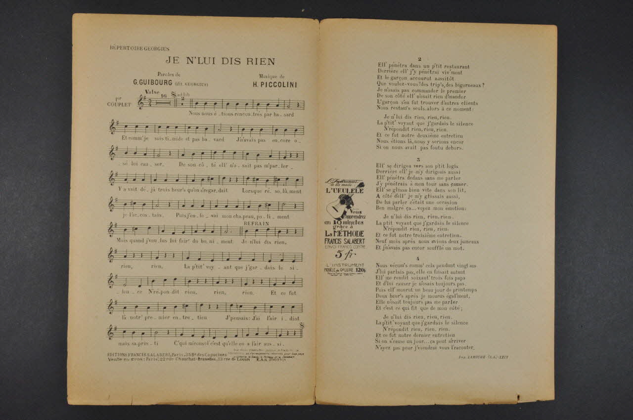 Des inscriptions renseignent le titre, les auteurs, les exécutants et l'éditeur. A l'intérieur, partition et paroles de la chanson. Au dos, liste d'autres partitions publiées par l'éditeur.Matériaux et techniques